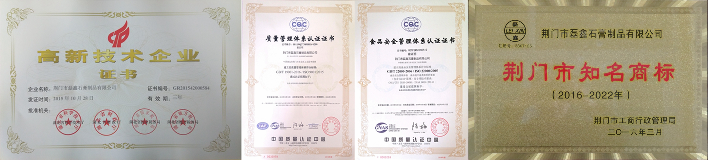 國家高新技術企業(yè)!湖北省專精特新中小企業(yè)!湖北省支柱產業(yè)細分領域隱形冠軍培育企業(yè)!湖北省守合同重信用企業(yè)!湖北省兩化融合示范企業(yè)!荊門市知名商標!中國高純、高白、高亮、超細硫酸鈣(石膏)生產基地!中國取得《食品生產許可證》的食品添加劑硫酸鈣(石膏)供應商!中國取得《飼料添加劑生產許可證》和《產品批準文號》硫酸鈣供應商!中國取得《出口飼料生產、加工、存放企業(yè)檢驗檢疫注冊登記證》飼料添加劑硫酸鈣供應商!通過ISO9001國際質量管理體系認證!通過ISO22000國際食品安全管理體系認證!通過HALAL國際清真認證!通過KOSHER猶太認證! 荊門市磊鑫石膏制品有限公司成立于2002年,位于石膏資源富集的湖北省荊門市東寶區(qū)工業(yè)園幸福路,占地27000余平方米,是一家在業(yè)內享有盛譽的集石膏、石膏粉和硫酸鈣制品研發(fā)、生產、銷售于一體的高新技術企業(yè)。公司擁有 “磊鑫”、“杰普生”、“凱氏蘇特”等5個國家注冊商標,2個發(fā)明專利,18個實用新型專利,50余篇自有技術應用研究,36篇權威期刊發(fā)表技術論文。主要產品有:醫(yī)藥級硫酸鈣、食品級硫酸鈣、飼料添加劑硫酸鈣、人造石透明填充粉,凱色粉、涂料及化妝品功能性填料和特級半水纖膏粉、混合石膏粉、模型石膏粉,建筑石膏粉等九大系列50余種產品。公司享有自營進出口權,客戶遍布全世界,是多家公司、集團和世界500強企業(yè)的優(yōu)秀供應商!產品遠銷到韓國、日本、俄羅斯、中國臺灣、東南亞、歐美、中東、非洲等國家和地區(qū)。公司緊靠207國道,焦柳鐵路穿境而過,距漢江碼頭50公里,長江沙市港90公里。交通運輸便利,確保及時供貨。“待用戶為上帝誠信為本,視質量為生命持之以恒!”是我們的企業(yè)宗旨,與我們合作是您明智的選擇,共謀發(fā)展是我們共同的目標!歡迎垂詢,歡迎惠顧! Your Trusted Source For Food-Grade Calcium Sulfate!——做全球更好的食品級硫酸鈣(石膏)供應商!          ——CGC·磊鑫石膏